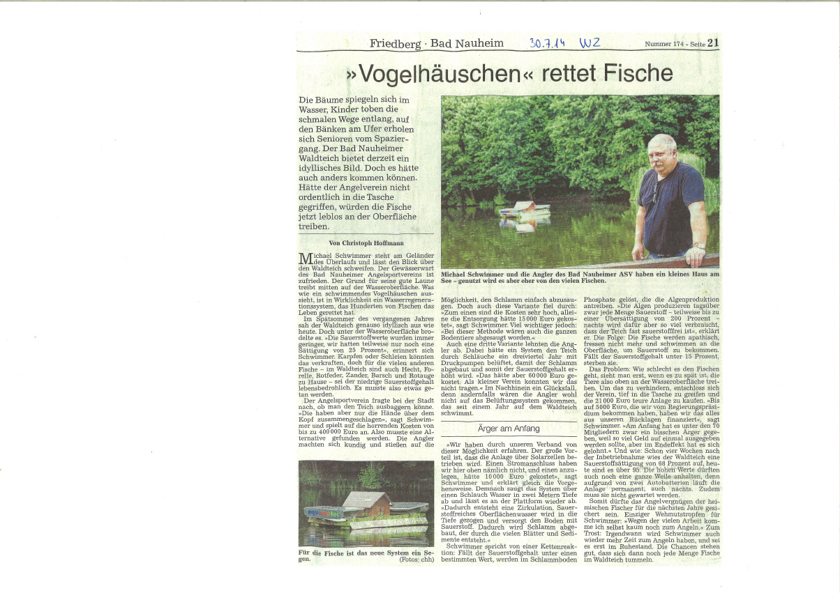 Artikel der WZ vom 30.07.2014 über das neue "Vogelhaus" an den Waldteichen