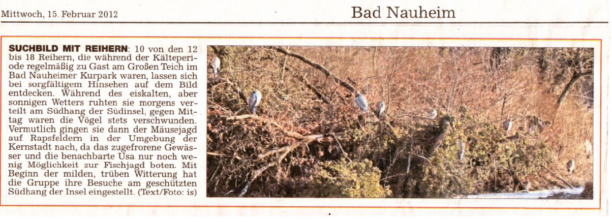 Artikel der WZ vom 15.02.2012 über eine große Ansammlung von Reihern