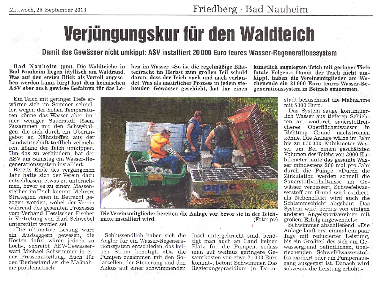 Artikel der WZ vom 25.09.2013 über die Installation des Regenerationssystems Aquamotec.
