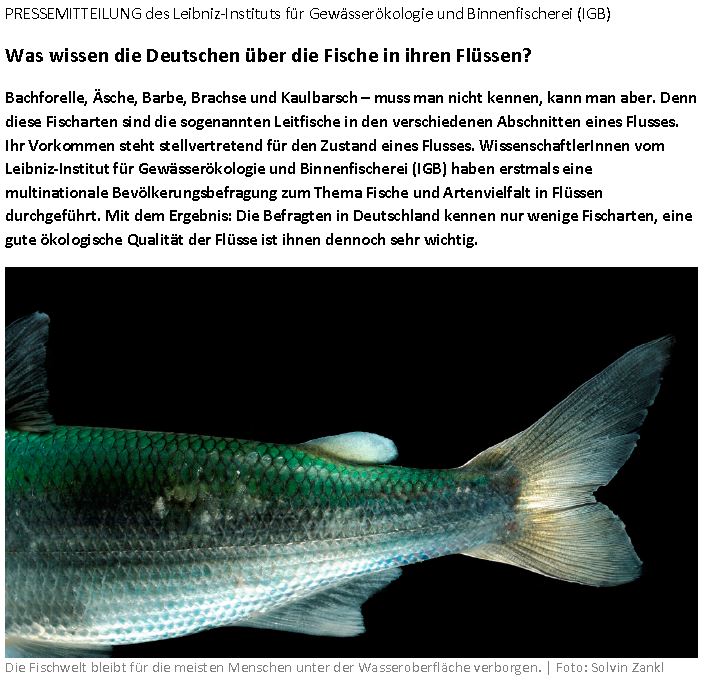 Ein interessanter Artikel [352 KB] zum Thema Was wissen die Deutschen über das Leben in ihren Flüssen?Quelle:PRESSEMITTEILUNG des Leibniz-Instituts für Gewässerökologie und Binnenfischerei (IGB)https://www.ifishman.de/presse/pressemitteilungen/