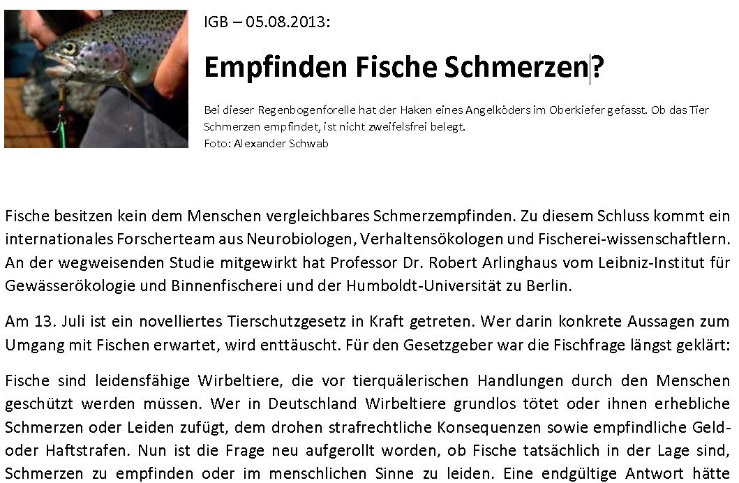 Ein interessanter Artikel [283 KB] zum Thema Schmerzempfinden bei Fischen, veröffentlicht unter http://www.fv-berlin.de/news/empfinden-fische-schmerzen-1.Die Originalpublikation ist Rose et al. (2014), Fish and Fisheries, findet sich auf www.ifishman.de und kann dort heruntergeladen werden: https://www.ifishman.de/publikationen/einzelansicht/422-can-fish-really-feel-pain/