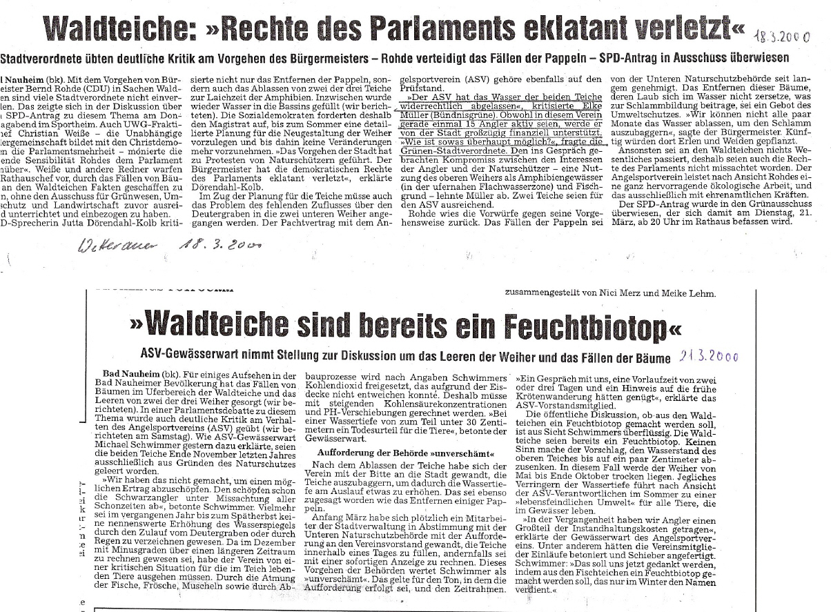 In dem Artikel wurde auch angedeutet, dass der Angelsportverein für das Abholzen der Weiden und Pappeln verantwortlich gemacht werden müsse. Dem ist nicht so. Wir waren weder Auftraggeber noch ausführende. Wie auch später im Jahr 2000 war diese Maßnahme vom Amt für Naturschutz und Landentwicklung des Wetteraukreises genehmigt.