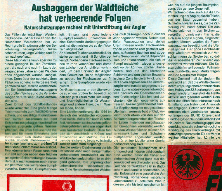 Nachdem die Stadt Bad Nauheim im Jahr 1989 damit begonnen hatte, den unteren Waldteich auszubaggern, regte sich, wie in Deutschland so üblich, sofort Widerstand dagegen. In einem Artikel von 1991 kam die Naturschutzgruppe zu Wort. Sie sprach unter anderem davon, dass nun zwei Drittel des Schilfbestandes endgültig vernichtet worden sei, dass die Ufer zu steil gemacht wurden, dass die Angler die Teiche tiefer machen wollen, um mehr Platz für Fische zu haben, dass wertvolle Unterwasserpflanzen vernichtet wurden und dass die Teichmuschel ausgerottet wurde.