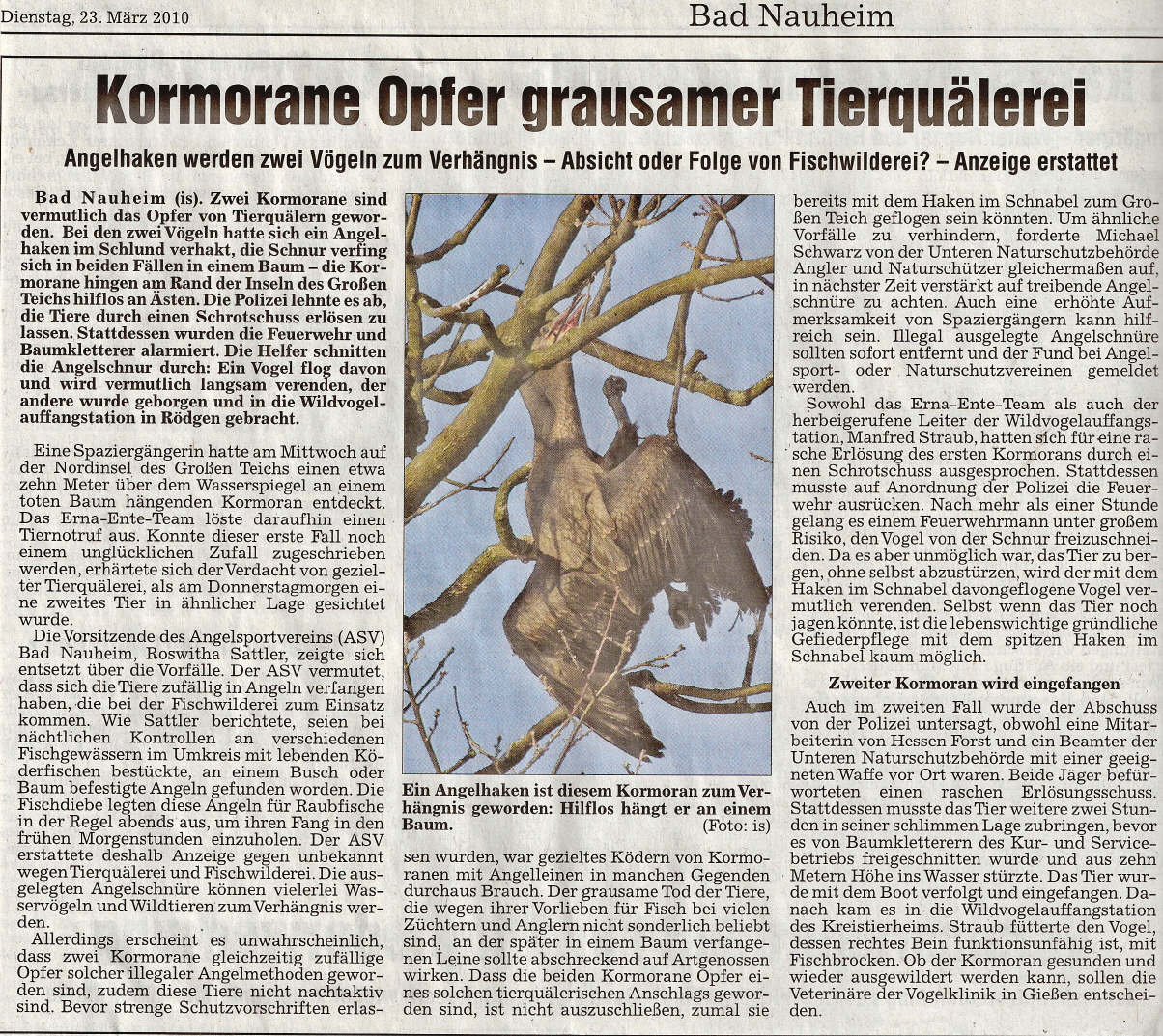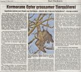 Wie man dem nebenstehenden Artikel aus der WZ entnehmen kann, sind zwei Kormorane Opfer von Angelschnüren geworden. So etwas ist nicht nur unglaublich grausam und verachtenswert, es ist auch im höchsten Maße kriminell. Deshalb wurde auch unverzüglich von unserer Seite Strafantrag gestellt. Befremdend ist dabei, dass die Anzeige von unserer Polizei gar nicht direkt entgegengenommen wurde, es wurde uns von den Beamten aufgetragen, das auf der Onlinewache zu erledigen.