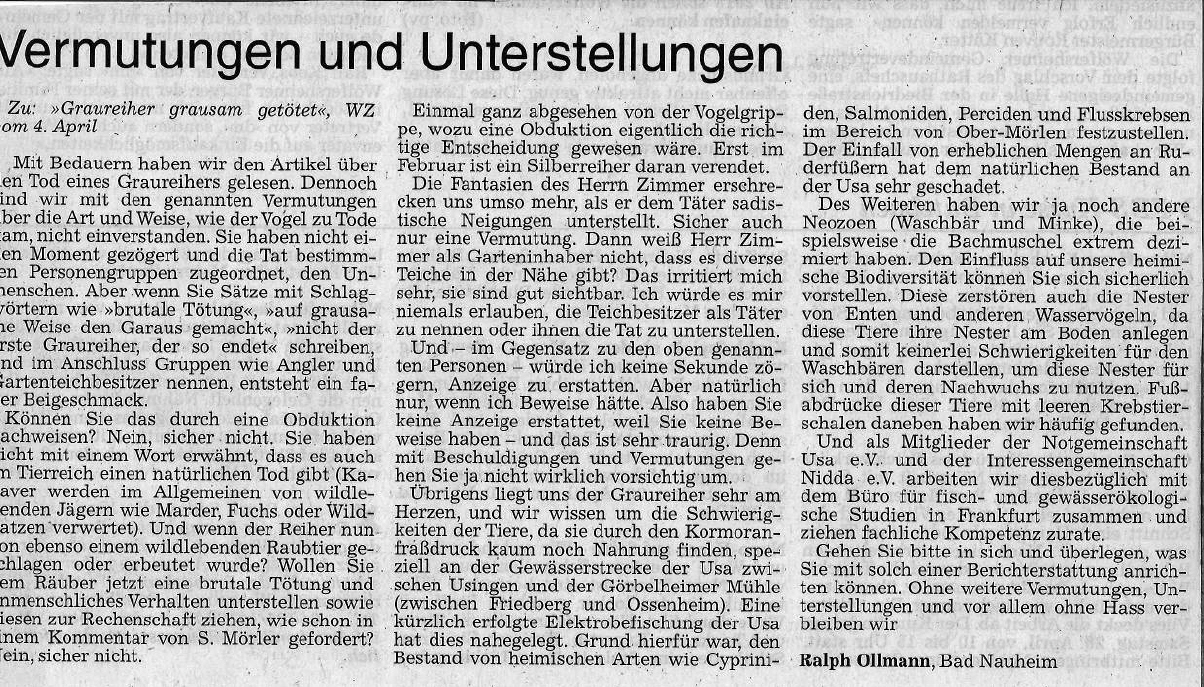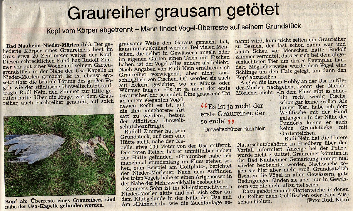 Es wird in dem Artikel von dem Umweltschutzbeauftragten der Stadt Bad Nauheim Rudi Nein erklärt, dass nur darüber spekuliert werden kann, wer das Tier getötet haben könnte. Aber gleich im nächsten Satz wird von ihm ausgeführt, dass der Graureiher bei Anglern und Besitzer von Gartenteichen ja sehr unbeliebt ist. Und es wäre nicht der erste seiner Art, der auf so grausame Weise endet. Und nur, weil man ihm nicht das Recht zugesteht, sich auf natürliche Weise zu ernähren.