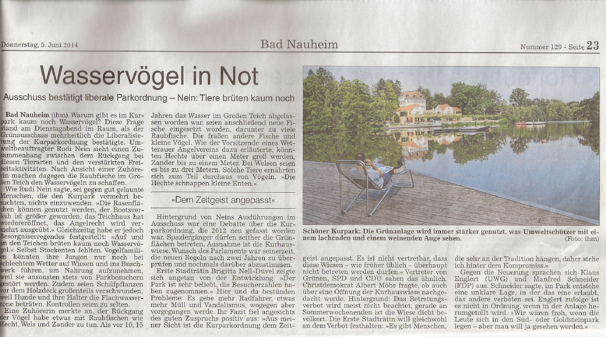 Wie man dem nebenstehenden Artikel aus der WZ entnehmen kann, gibt es immer weniger Wasservögel am großen Kurparkteich.